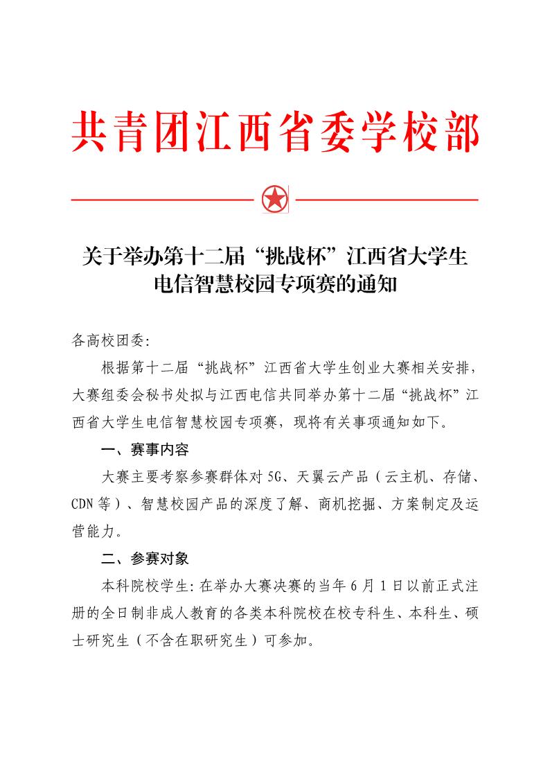 关于举办第十二届“挑战杯”江西省大学生电信智慧校园专项赛的通知